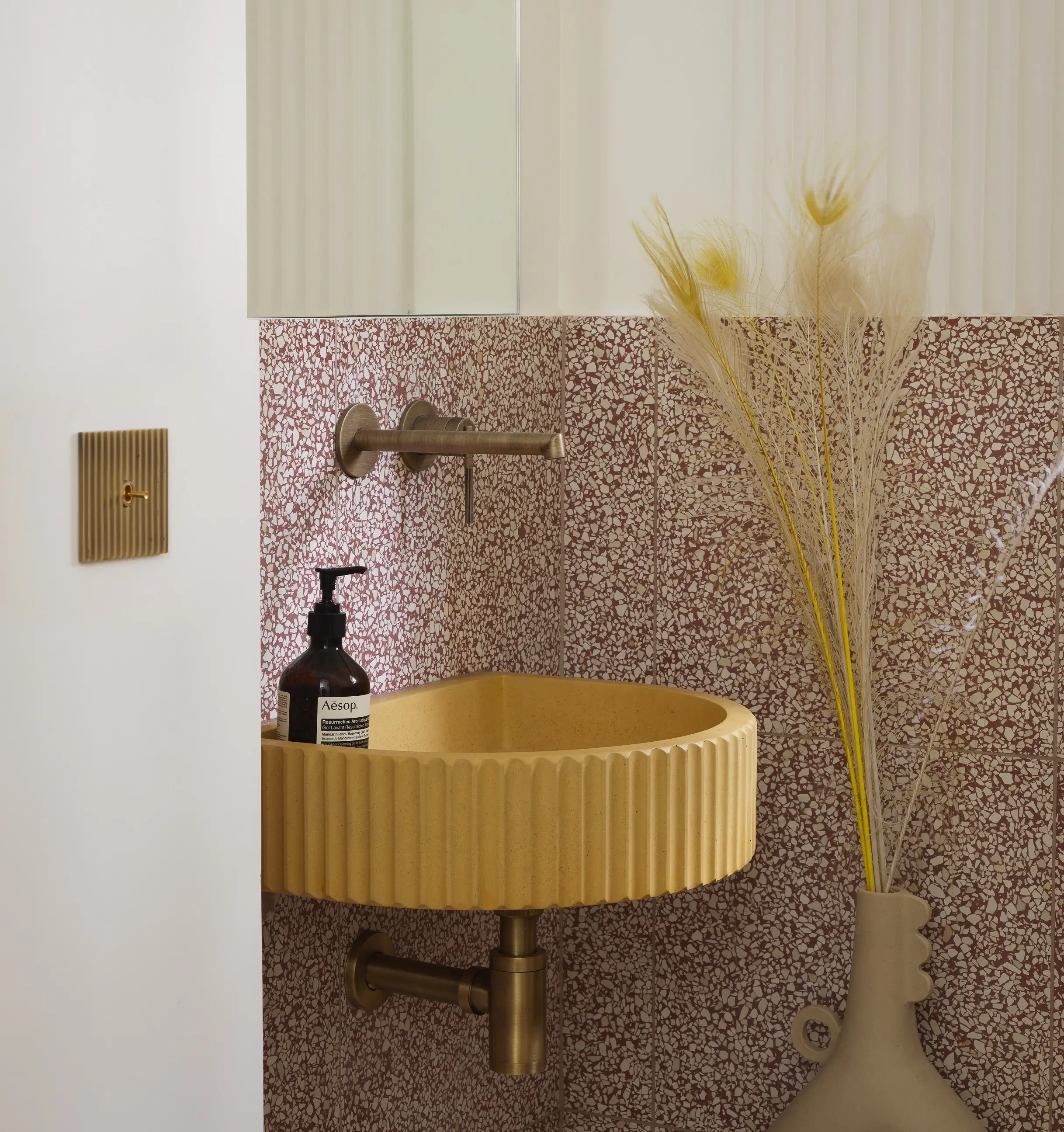 L’interrupteur de salle de bain est un élément décoratif à part entière. Dans cette pièce en particulier, il permet un dialogue subtil entre la lumière et la matière.